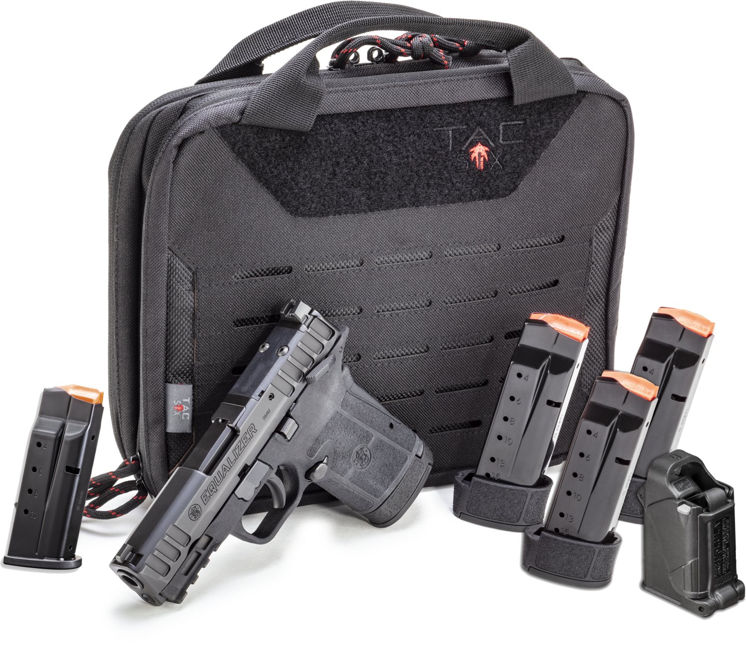 The Smith & Wesson Equalizer 9mm Pistol Range Bag Bundle comes with a 10-round, a 13-round and three 15-round magazines. The 9mm pistol has a 3.675-inch barrel with 10, 13 and 15-round capacity. This micro-compact handgun has an ambidextrous manual thumb safety, a single-action trigger and white dot sights. It is optics-ready with a Picatinny rail and a stainless steel slide, a polymer frame, a textured grip and an Armornite finish.