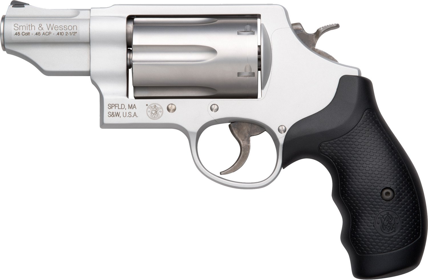 The Smith & Wesson Governor .410/.45 ACP/.45 LC Revolver features a scandium alloy frame with a matte finish. The revolver is designed with a ramp front sight and a fixed rear sight, and comes with moon clips. Accepts .410 2-1/2" shotshells, .45 ACP or .45 Colt ammunition (sold separately).