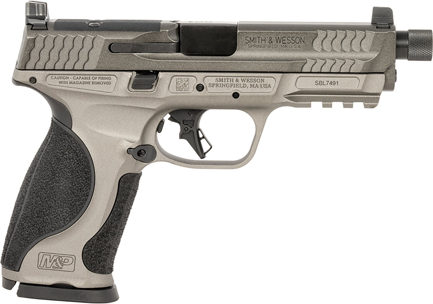 The Smith & Wesson M&P M2.0 Full Size 9mm Luger Striker Fired Pistol is made with a stainless-steel barrel, a full-size aluminum frame and a polymer grip style. The pistol is designed with a 3-Dot white sight and a Picatinny rail and comes with 2 magazines and 4 Palmswell grip inserts.