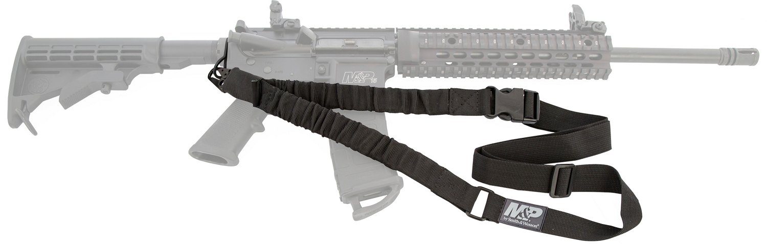 Achieving a convenient, safe side-carry position for your firearm is easy with the Smith & Wesson M&P Single Point Sling Kit. The flexible, high-density bungee sling is adjustable and accepts snap hook-style attachments (sold separately), while the AR receiver end plate's ambidextrous design allows use by all shooters. Made in USA.