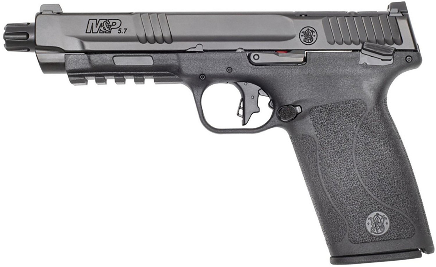 This Smith & Wesson M&P5.7 5.7 x 28mm Semiautomatic Pistol is designed for the needs of recreational shooters. It includes two 10-round magazines and features a 5-inch locked-breech tempo barrel with an Armornite finish, an optic-ready, stainless-steel slide, a polymer frame and grips, a flat-face trigger and adjustable, driftable white-dot sights.