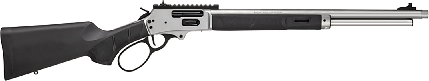 Arm yourself with the Smith & Wesson Model 1854 .45-70 Govt Lever Action Rifle. It is lever action with a 6-round capacity. The 410 stainless steel barrel is 20-inches long, and it is equipped with a forged 416 stainless steel receiver. The black synthetic stock with textured grip panels finishes off the design.