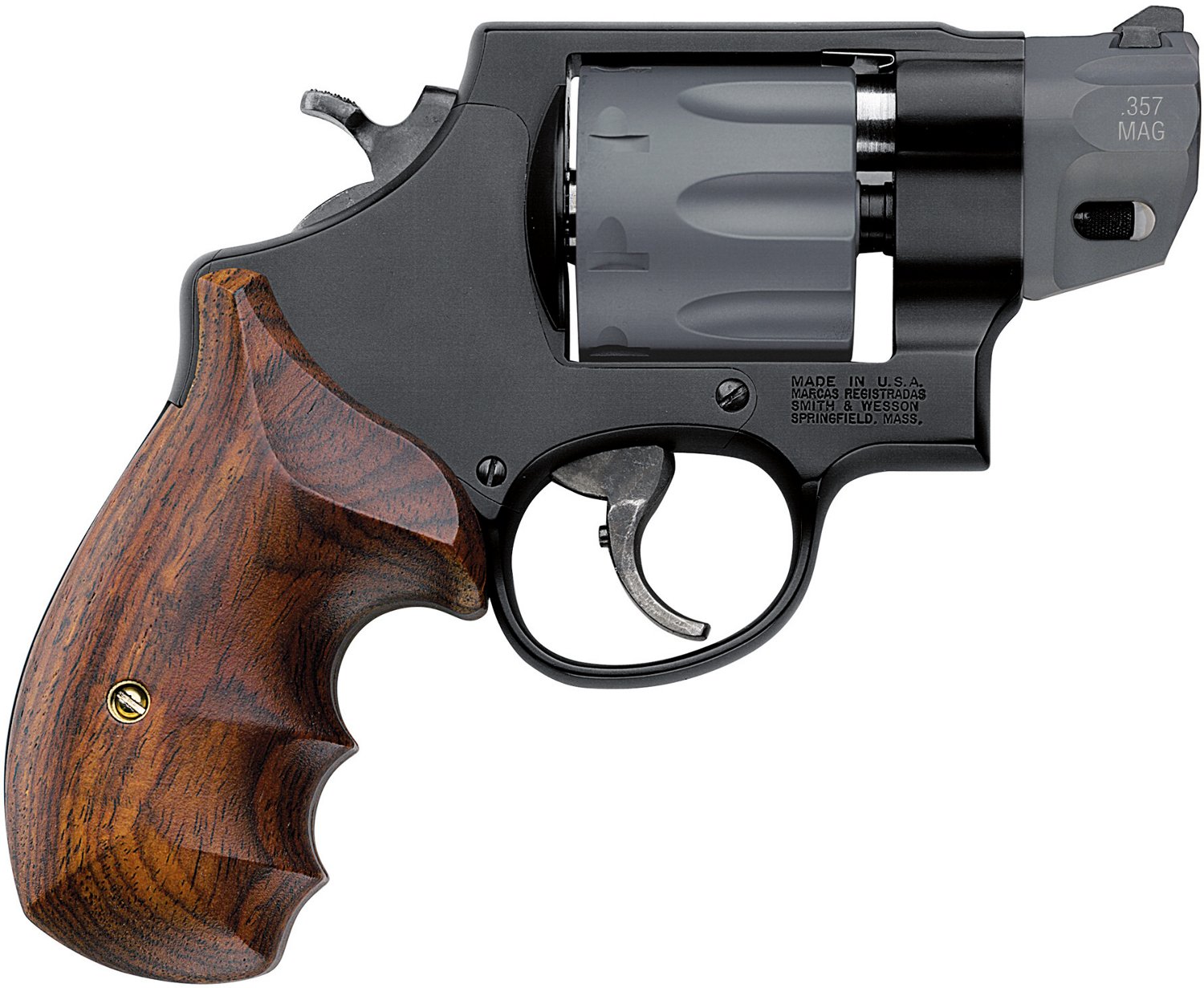The Smith & Wesson Model 327 Performance Center .357 Magnum +P Revolver is great for personal protection. Designed with a titanium shroud over the cylinder and barrel, this pistol features a wood grip, an exposed hammer and a PC trigger with a stop. Ramp front sight. Fixed U-notch rear sight.