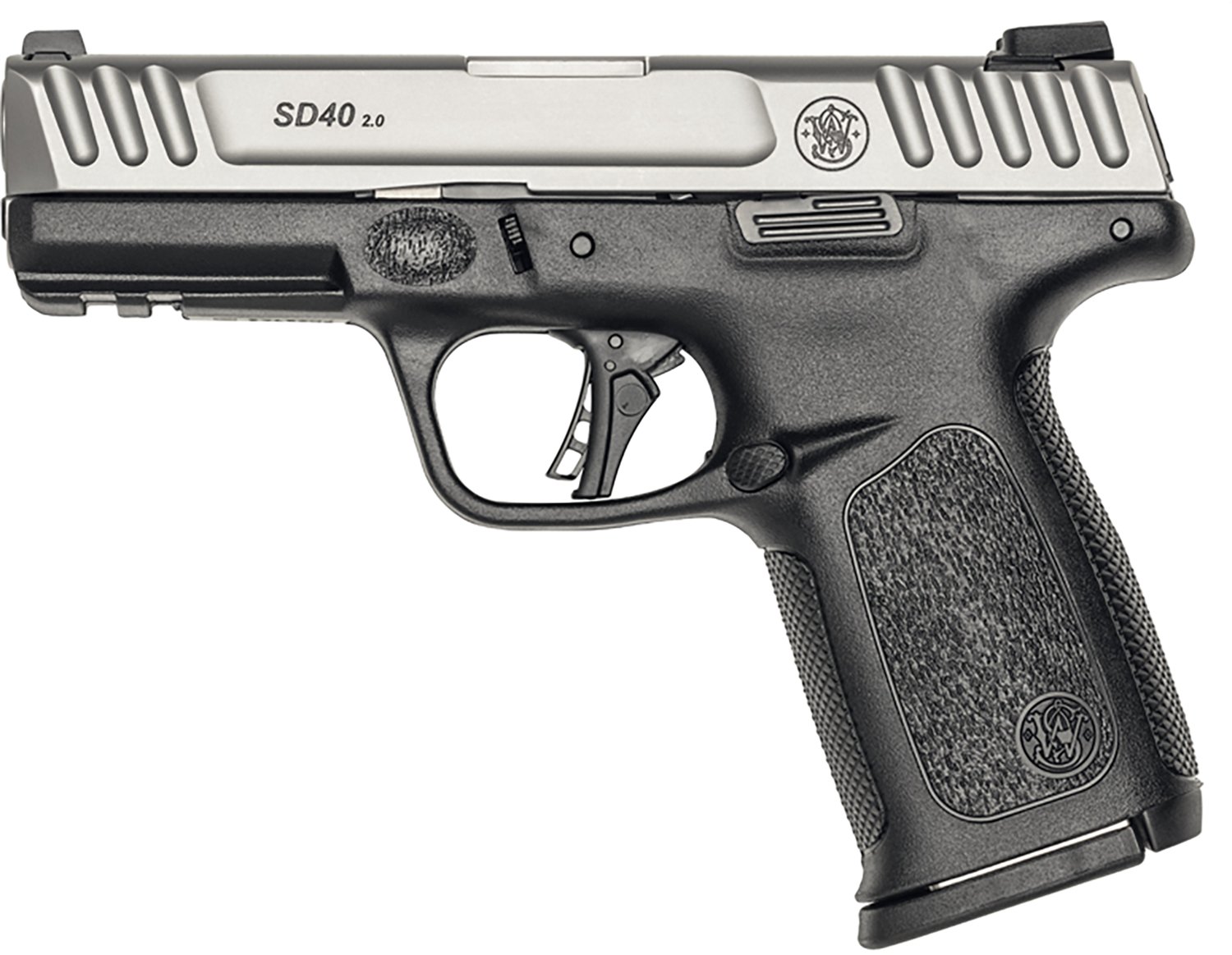 The Smith & Wesson SD40 2.0 .40 S&W Semiautomatic Pistol has several features that make it ideal for shooting recreationally, including a polymer frame and grips, a 4-inch barrel with a stainless finish, an enhanced SDT trigger, white 3-dot sights and a Picatinny-style rail. Its slide is serrated both front and rear, and it comes with a 10-round magazine.