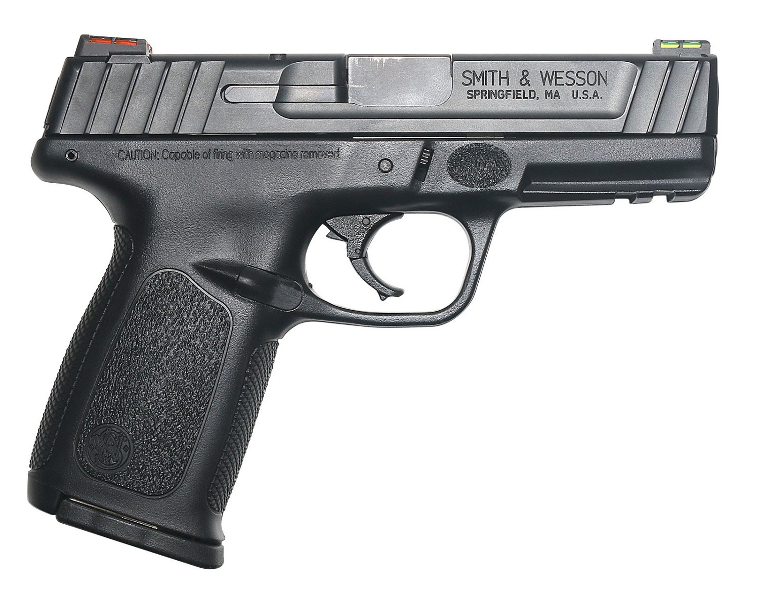 The Smith & Wesson SD40Self-Defense Hi-Viz Fiber Optic 40 S&W Full-Sized 14-Round Pistol features a stainless-steel barrel and slide with an Armornite® finish and a Self Defense Trigger (SDT™). This centerfire, double-action pistol has a Picatinny rail and HI-VIZ® fiber-optic front and rear sights. Made in USA.