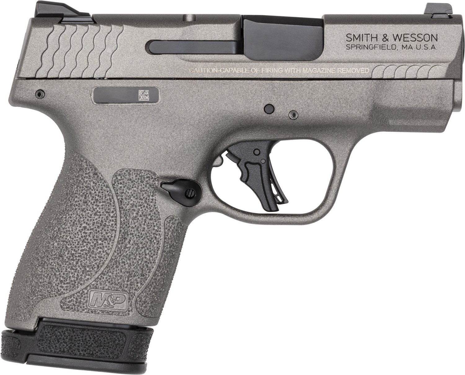 The Smith & Wesson Shield Plus 9mm Semiautomatic Pistol is a centerfire, semiautomatic handgun with a 13+1 round capacity. Its polymer frame is ergonomically designed and features aggressive texturing on the front strap, backstrap and grip. The slide is serrated at the front and back. The gun comes equipped with dovetailed white dot sights and a Picatinny accessory rail.