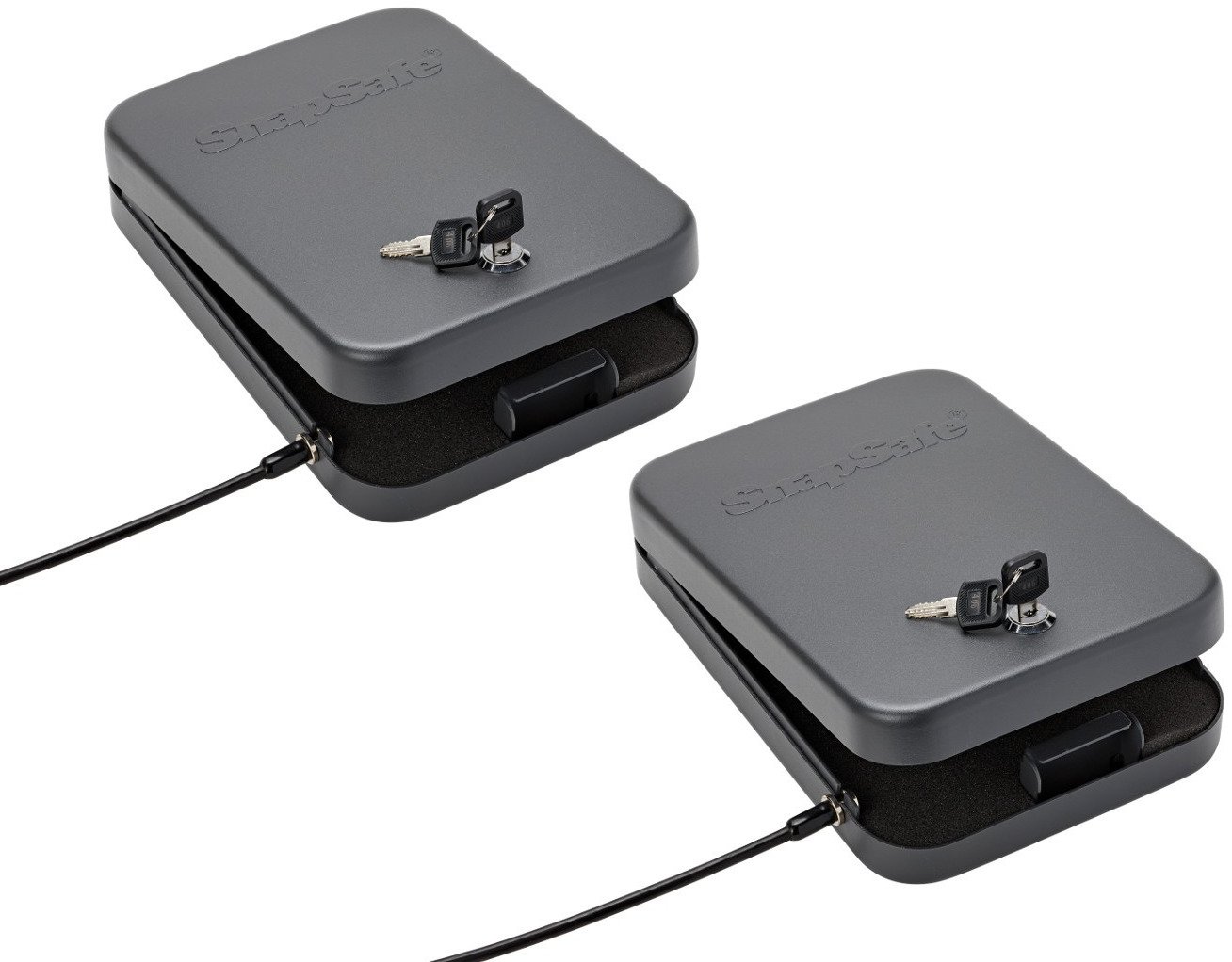 Ensure that your handguns are taken care of during your next trip with the SnapSafe Keyed Alike Extra-Large Lock Boxes 2-Pack. The safes are constructed from 16 gauge steel material and have interior foam padding inside for reliable protection, and the included steel cables help prevent theft. The lockboxes are fireproof for up to 1 hour at 2,300 degrees Fahrenheit and are designed to meet TSA firearm guidelines.