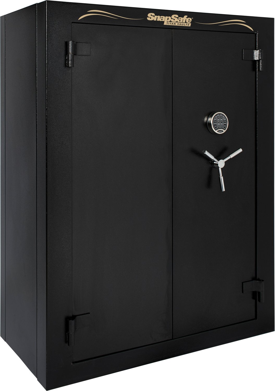 The SnapSafe Super Titan 36-Gun Double Door Safe offers durable protection and ample storage for firearms and valuables. Built with 9-gauge steel, it resists prying and sledgehammer attempts, while the EMP-proof SecuRam™ lock provides dual electronic and mechanical operation. With Fire Shield technology, it withstands heat up to 2,300°F for one hour, complemented by heat-activated fire seals for added defense. The interior features adjustable, lined shelves for organized storage, accommodating up to 36 guns. Magnesium oxide panels offer resistance to fire, moisture, mold, and insects, enhancing durability. The safe includes a full shelf, a gun rack, two half shelves, and a divided shelf for customizable storage. Pre-drilled holes simplify floor mounting, and 14 chrome steel locking bolts with a spring-loaded relocker enhance security. This robust safe blends advanced protection with functional design for firearm security.