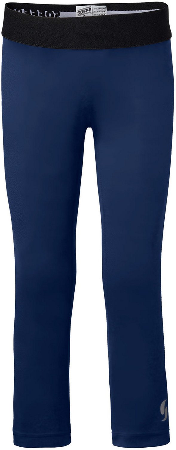 She'll love being stylish as well as active when she works out in the Soffe™ Girls' Soffe Dri Capri Pant, which is made of polyester and spandex jersey with moisture-wicking Soffe™ Dri fabric technology for dry, comfortable wear. The elastic waist offers a snug fit, while the flatlock seams help minimize chafing. Compression fit. Low rise.