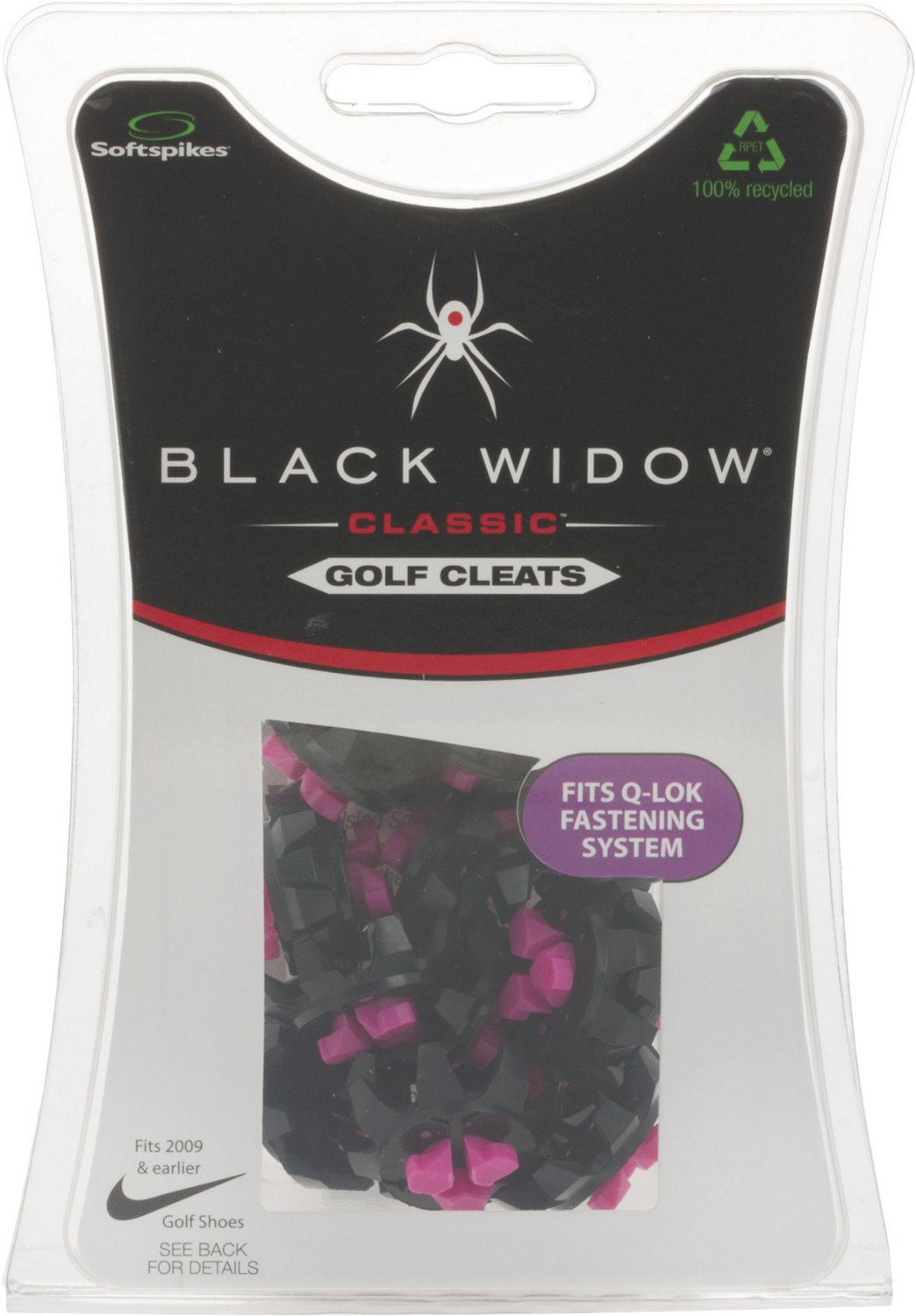 The Softspikes Black Widow Classic Q Lok Golf Shoe Spikes are green-friendly spikes that offer excellent traction and comfortable wear. The spikes feature Dynamic Cleat Technology that transmits abrasive forces to the center of the cleats, causing them to wear from the inside out, while the Q-Fit Insert System features a distinctive triangle base and locks cleats into place with a quarter turn.