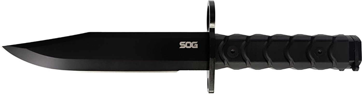Carry around a sharp tool with the SOG BAR15D Clip Point Bayonet. It is crafted from AUS-8 steel to retain its edge long-term. The fixed blade style improves strength, and its textured G10 handle fits naturally in your hand to reduce fatigue. The integrated AR-compatible barrel ring allows you to attach the blade to your rifle.