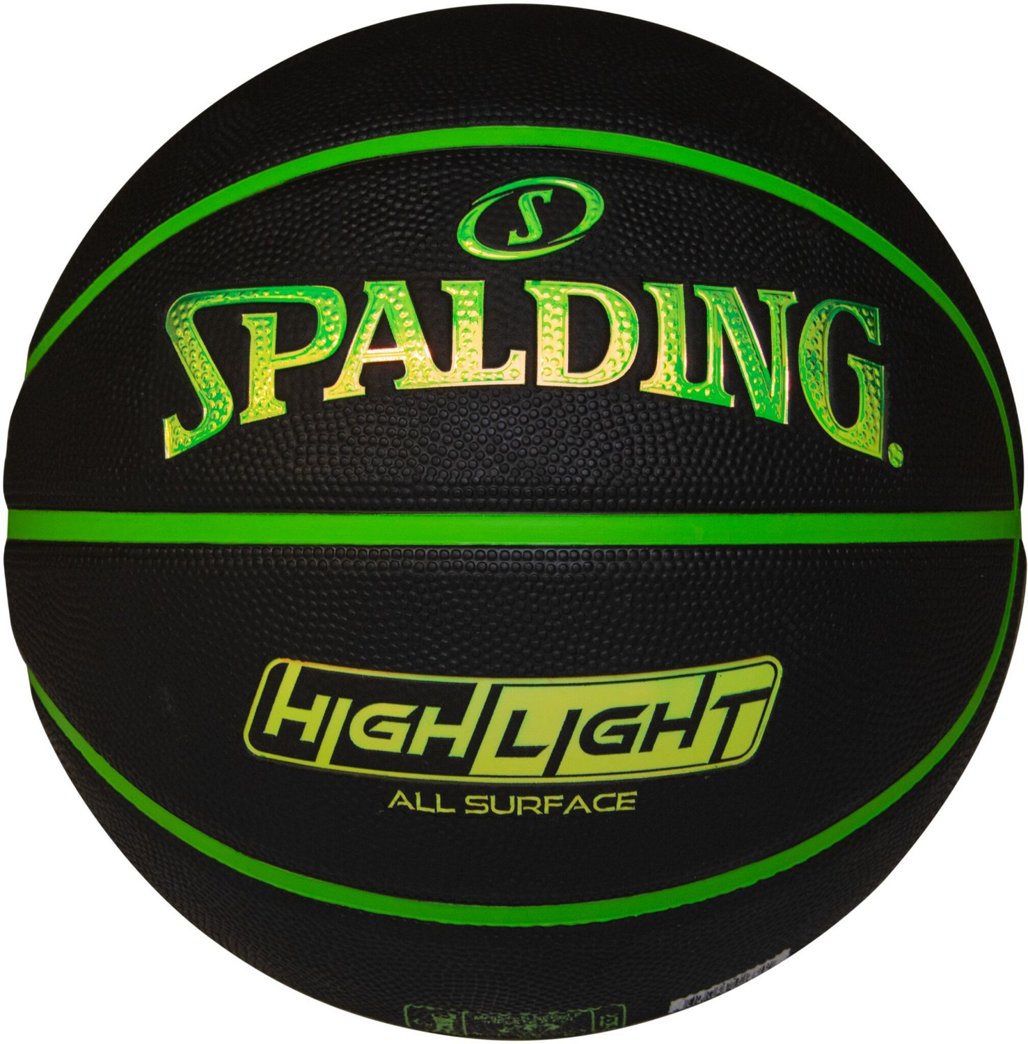 Brighten up your game with the Spalding Highlight Rubber Basketball. The performance rubber cover feels soft and is durable on all court surfaces, and the raised stitching allows maximum control. Responsive core delivers reliable bounce. Glow-in-the-dark colored foil brings extra fun to nighttime play.