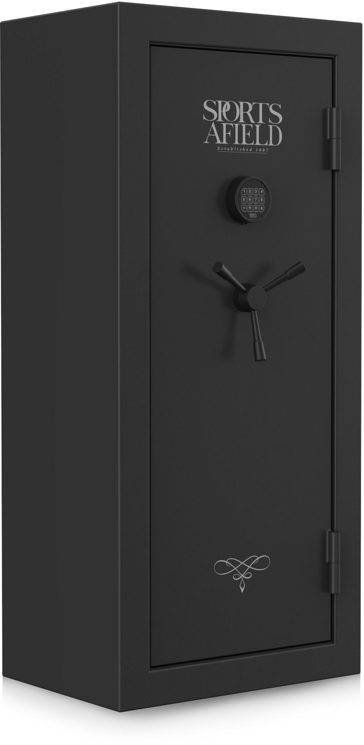 The Sports Afield 30-Gun Safe with E-Lock is the pinnacle of secure firearm storage with advanced features. This safe, designed to accommodate up to 30 guns, offers maximum security with its fully programmable electronic lock. The E-Lock provides a modern touch to access control, providing your firearms with the utmost protection. Crafted from solid steel, the safe is not only fire-rated but also waterproof, guarding against theft, fire, and natural flood disasters. The carpeted interior and adjustable shelves provide a protective and organized space for your long guns. For additional security, the bolt-down kit and override keys are included. Buy the Sports Afield 30-Gun Safe for secure firearm storage, featuring a durable powder coat finish and free locksmith services, making it an ideal solution for safeguarding your valuable firearms collection.