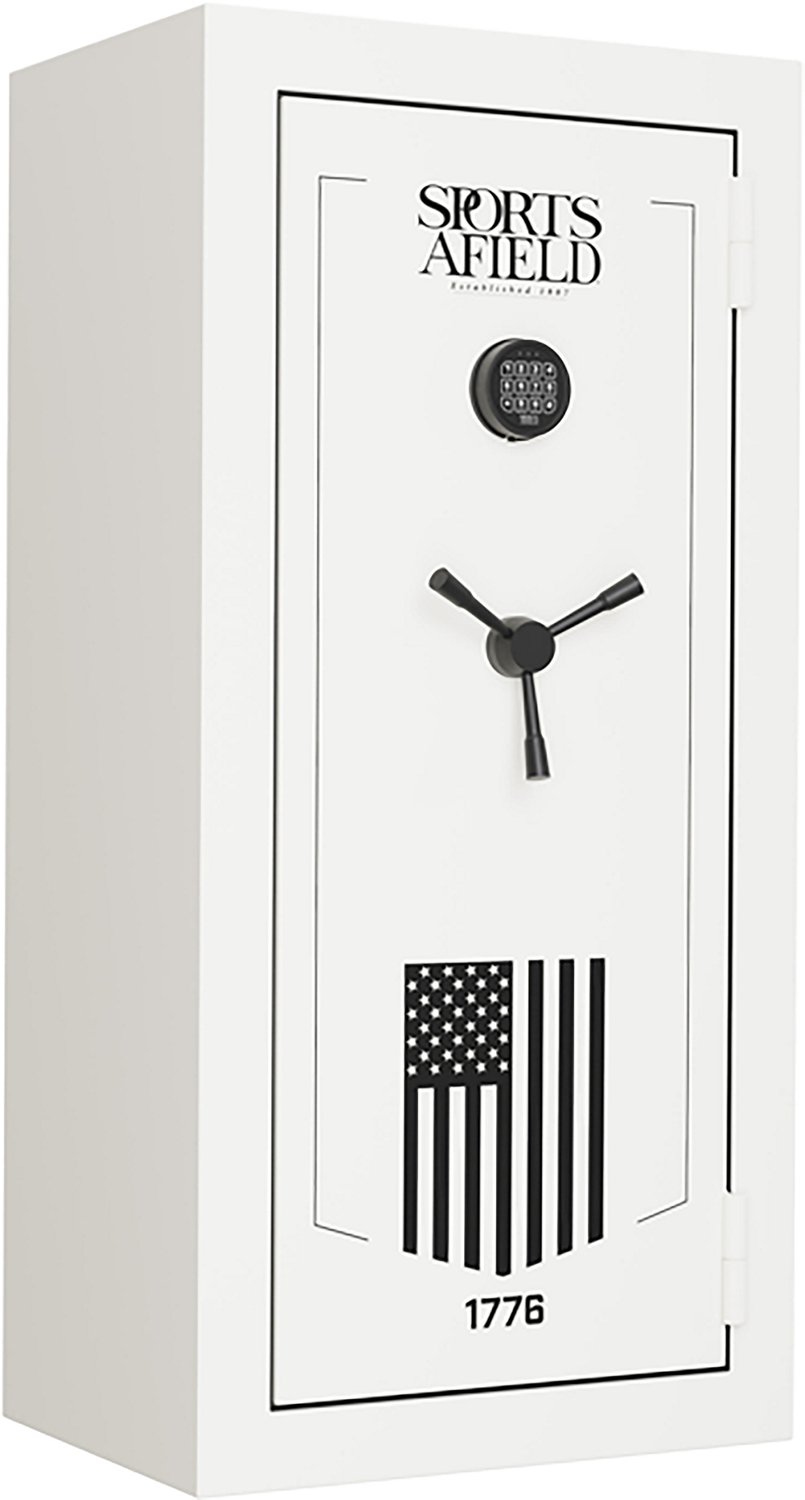 Display your patriotism while securing your collection with the Sports Afield 30 Gun Safe with Flag, the large-capacity unit you select for fire protection and robust security. You will protect your valuables with confidence knowing this safe carries a fire rating of 30 minutes at 1400 degrees Fahrenheit. The safe is designed to accommodate up to 30 long guns and features a fully carpeted interior with configurable shelving to optimize storage space. Execute rapid access using the programmable electronic lock, which controls the three-sided locking bolt system. The striking American Flag graphic on the exterior door allows you to integrate high-level security with a proud, bold presentation in your home or garage. Invest in comprehensive security and patriotic design backed by a lifetime warranty when you choose the Sports Afield 30 Gun Safe with Flag.