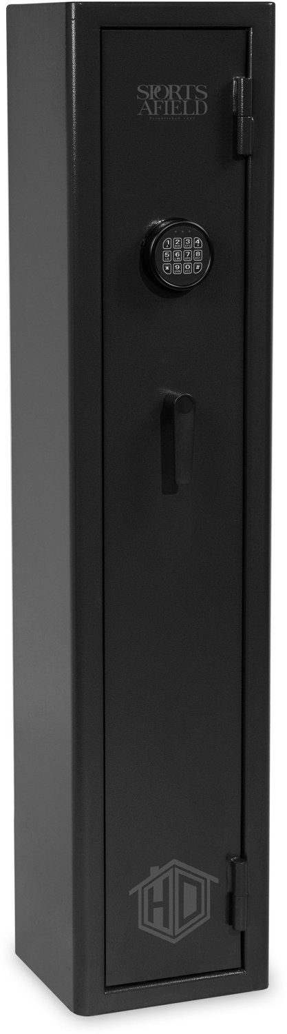 Keep your long guns secure with the Sports Afield Home Defense 4-Gun Fireproof Gun Safe with Electronic Lock. This electronic safe has a carpeted interior to protect your guns' finish from scratches and a scoped rifle standoff, allowing you to store a rifle with a scope attached. The 16 gauge steel door is reinforced by five 1-inch locking bolts and a fail safe override key. The expanding door seal protects your guns from fire damage.