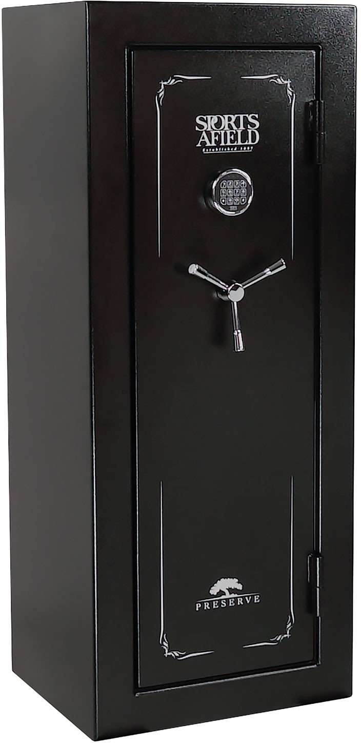 Protect your rifles, ammo and other important items inside the Sports Afield Preserve 28-Gun Safe. The safe is made of heavy-gauge steel with locking steel bolts for reliable protection, and the fire-resistant design can handle temperatures up to 1,200 degrees Fahrenheit for up to 40 minutes. An electronic keypad lets you pick your chosen access code.