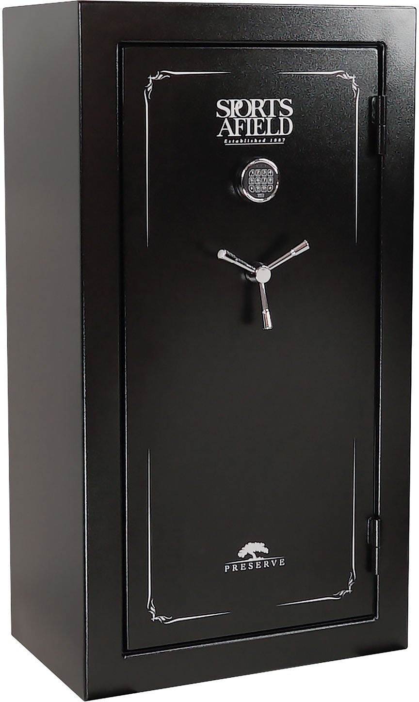 Protect your rifles, ammo and other important items inside the Sports Afield Preserve 38-Gun Safe. The safe is made of heavy-gauge steel with locking steel bolts for reliable protection, and the fire-resistant design can handle temperatures up to 1,200 degrees Fahrenheit for up to 40 minutes. An electronic keypad lets you pick your chosen access code.