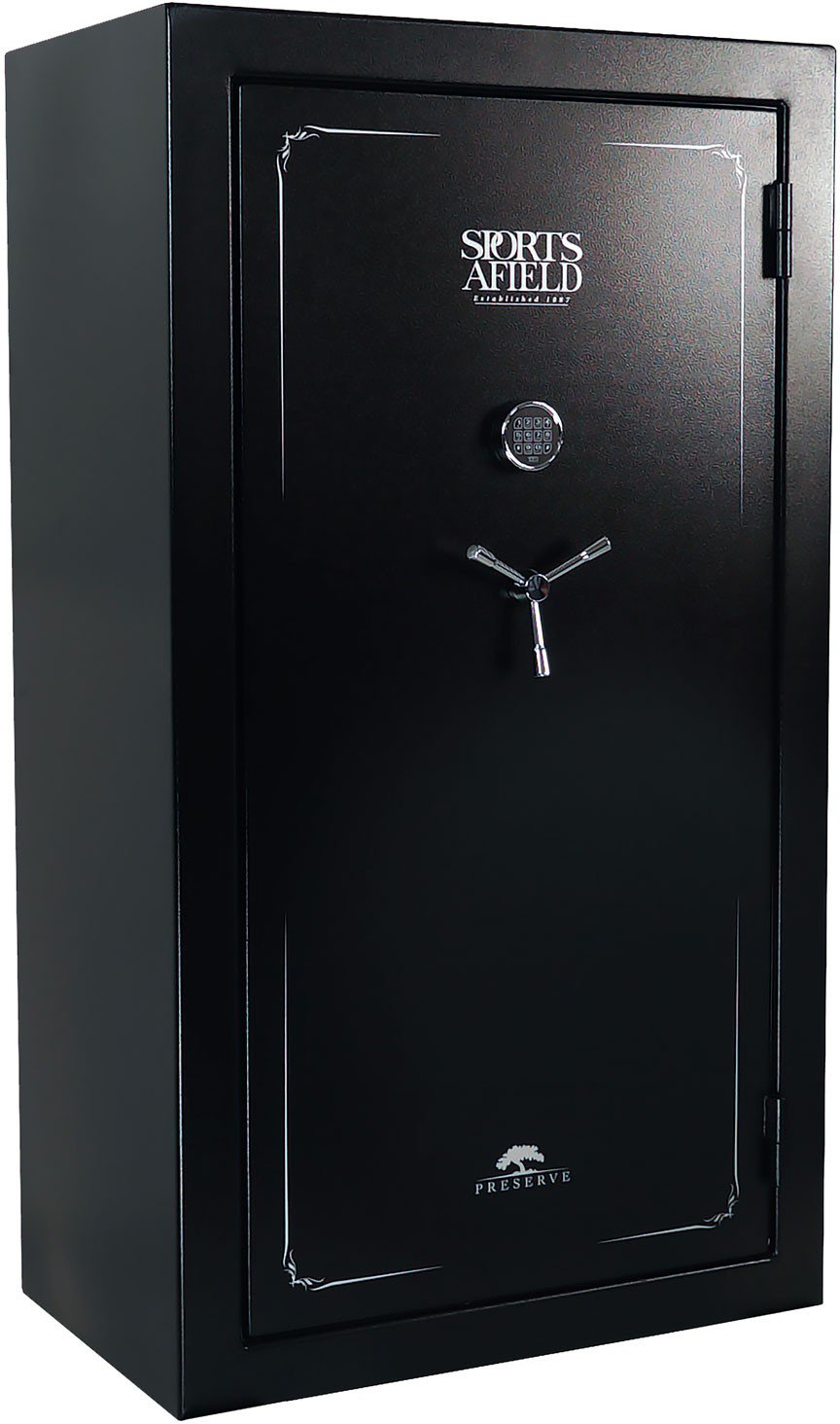 Protect your rifles, ammo and other important items inside the Sports Afield Preserve 68-Gun Safe. The safe is made of heavy-gauge steel with locking steel bolts for reliable protection, and the fire-resistant design can handle temperatures up to 1,200 degrees Fahrenheit for up to 40 minutes. An electronic keypad lets you pick your chosen access code.