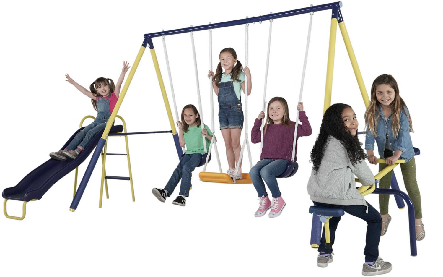 Make fun family memories with the Sportspower Palmview Swing Set. The set features 2 swings, a wavy slide, a standing swing and a teeter-totter for hours and hours of group play. The swings come with vinyl chain covers to prevent pinching, and the slide is built tough for endless sliding. Meets or exceeds ASTM standards.