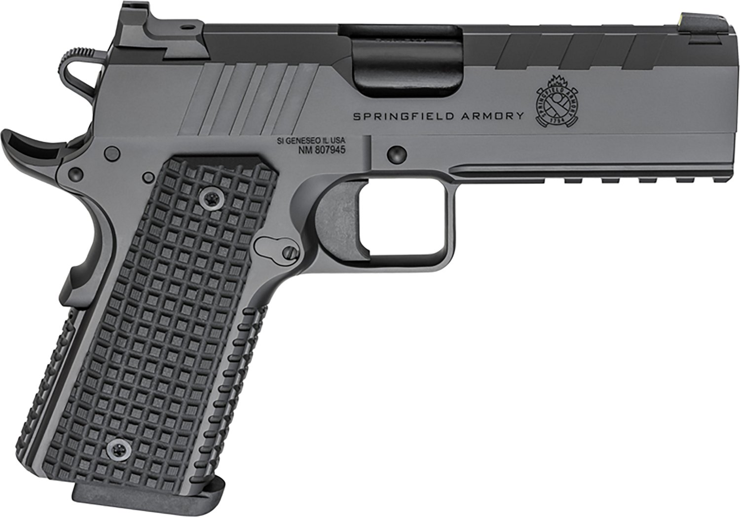 Arm yourself with the Springfield Armory 1911 Emissary 9mm Luger Single Action Pistol. It is single action with an 8-round capacity. The carbon steel match grade bull barrel is 4.25-inches long, and its stainless steel frame is equipped with a beavertail and Picatinny rail. The serrated carbon steel slide finishes off the design.