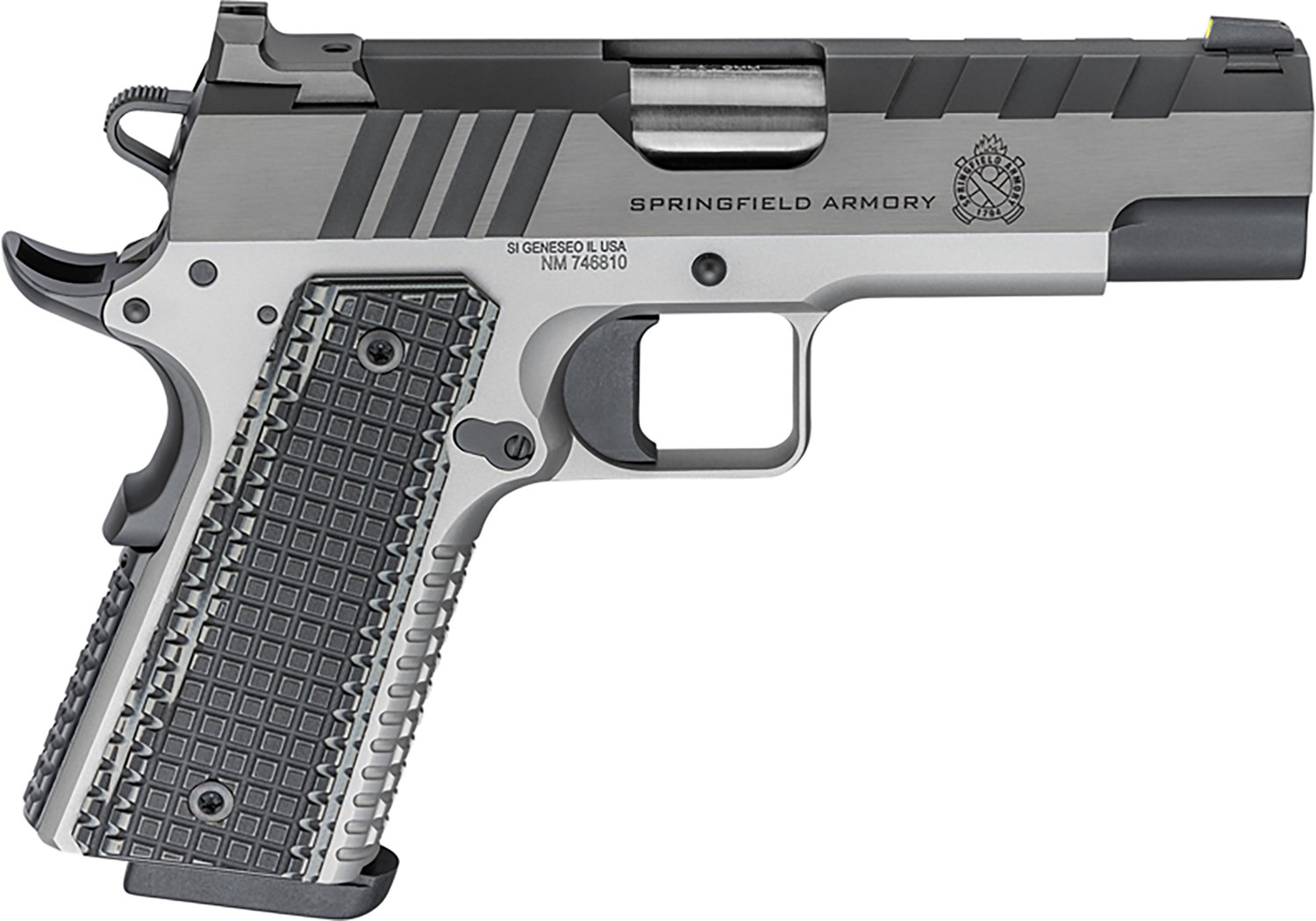 Arm yourself with the Springfield Armory 1911 Emissary 9mm Luger Single Action Pistol. It is single action with a 9-round capacity. The stainless steel match grade bull barrel is 4.25-inches long, and its stainless steel frame is equipped with a beavertail and Picatinny rail. The contrast tritium front sight and U-Notch rear sight finish off the design.