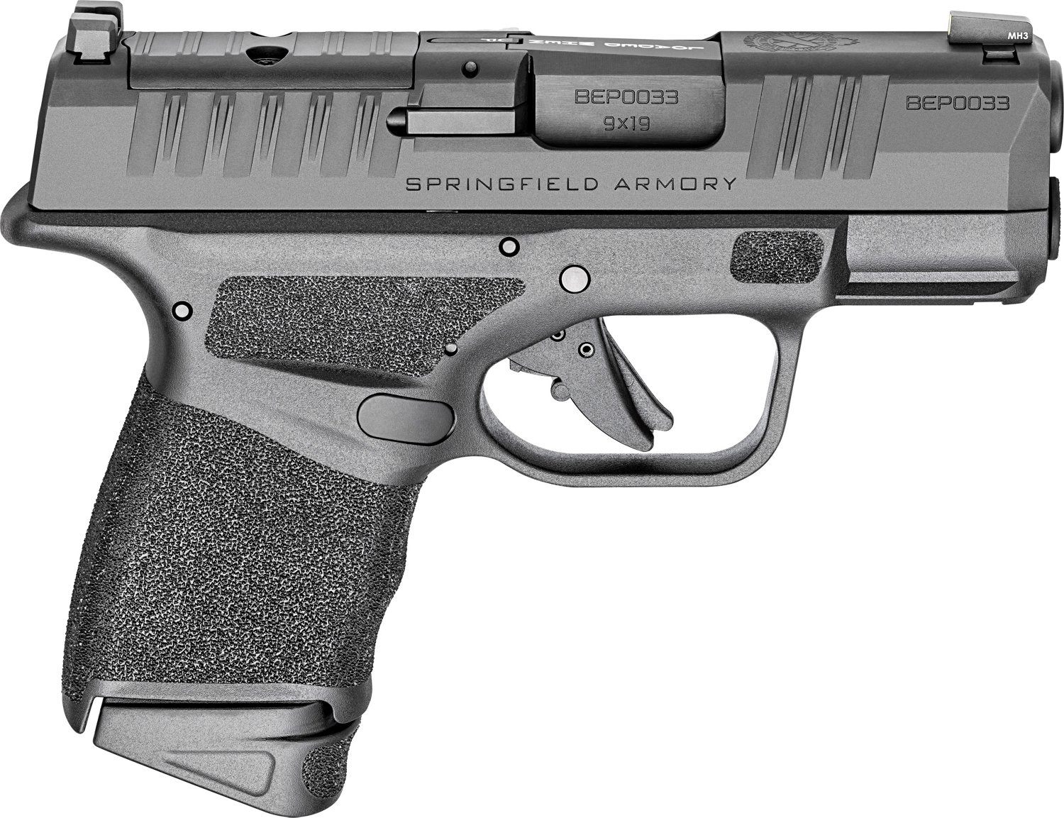 The Springfield Armory Hellcat OSP 9mm Pistol features striker fired action and a 10-round capacity. It has a hammer forged barrel, polymer frame and top slide serrations. Tritium night sights, Gen 2 trigger and a textured grip complete the design.