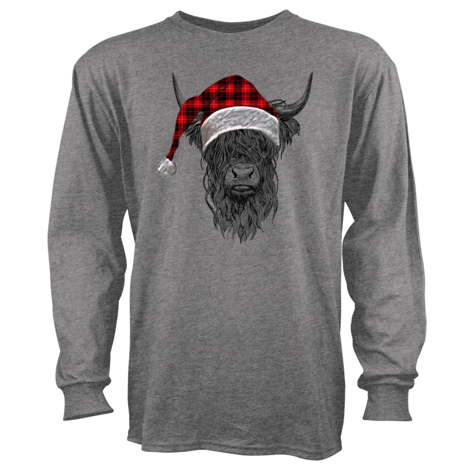 Front chest showcases a highland cow graphic with a Santa hat