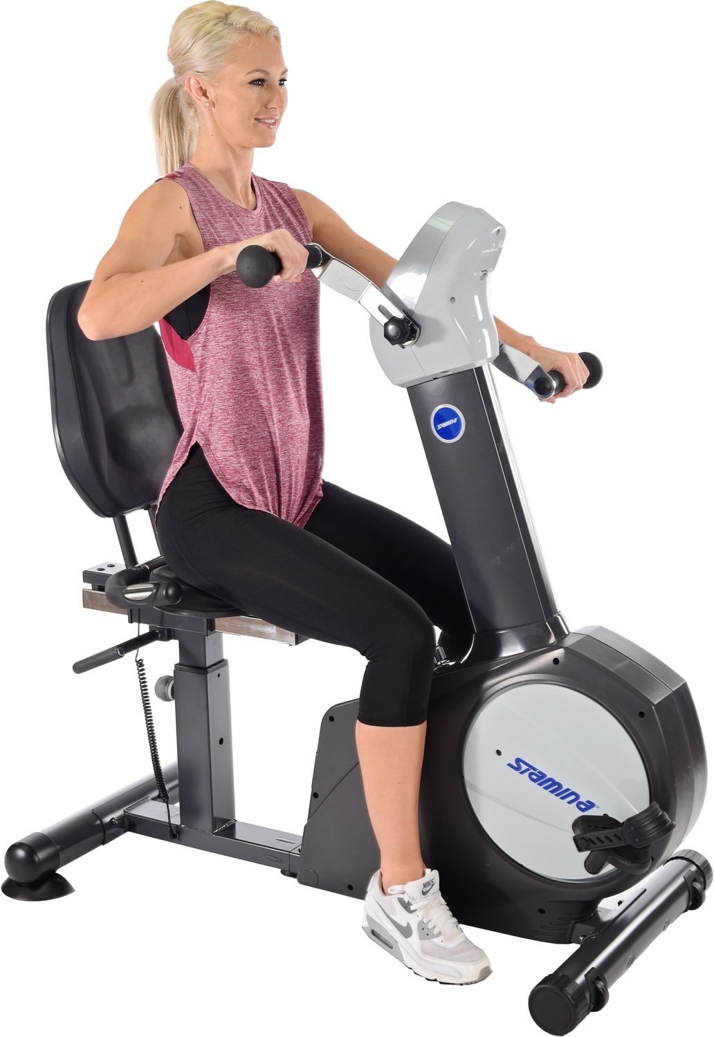 Enjoy a complete workout with this Stamina Elite Total Body Recumbent Bike. The weighted foot pedals feature adjustable straps to keep your feet secure, while the upper hand pedals let you exercise your shoulder, back and arm muscles. With 8 levels of smooth magnetic resistance, the bike helps you achieve your fitness goals.