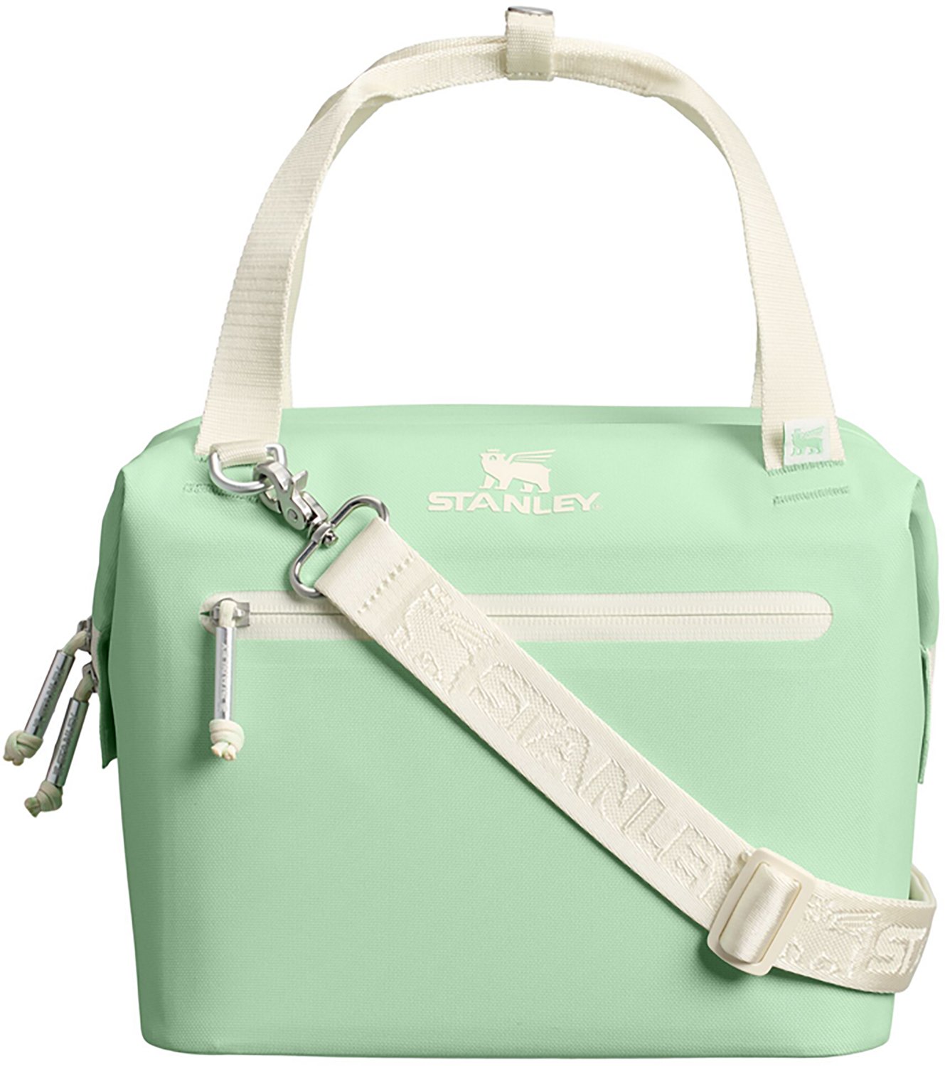 Keep your food refrigerated with the Stanley All Day Julienne 7.4 QT. Mini Cooler. The 100% recycled polyester makes dining outside more sustainable. Its 10-can storage capacity keeps your goods cool for 12 hours, and the hinge top zips open to help with unpacking. Its optional strap can be attached to sling over your shoulder.