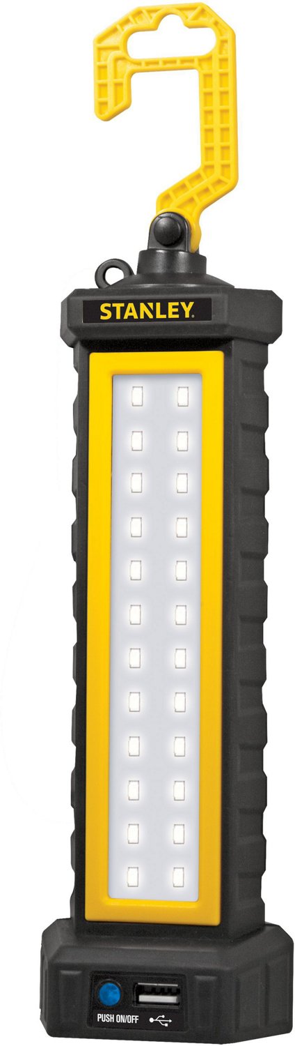Light up your space with the Stanley Rechargeable 500 Lumen LED Work Light. This work light is built with a heavy-duty rubber overmold and shatterproof design for long-lasting use. The 24 ultra-bright LED bulbs provide up to 500 Lumens of light, while the 360-degree hanging hook and magnetic base allow for versatile use.