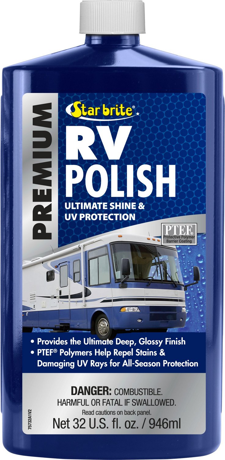 Protect your RV all season long with the Star brite 32 oz Premium RV Polish. With PTEF® polymers and advanced UV inhibitors, this polish provides long-lasting protection against dirt, grease, grime and sun damage. It's easy to use, can be applied over old wax or polish and is safe on fiberglass, painted surfaces and high-polish metals.