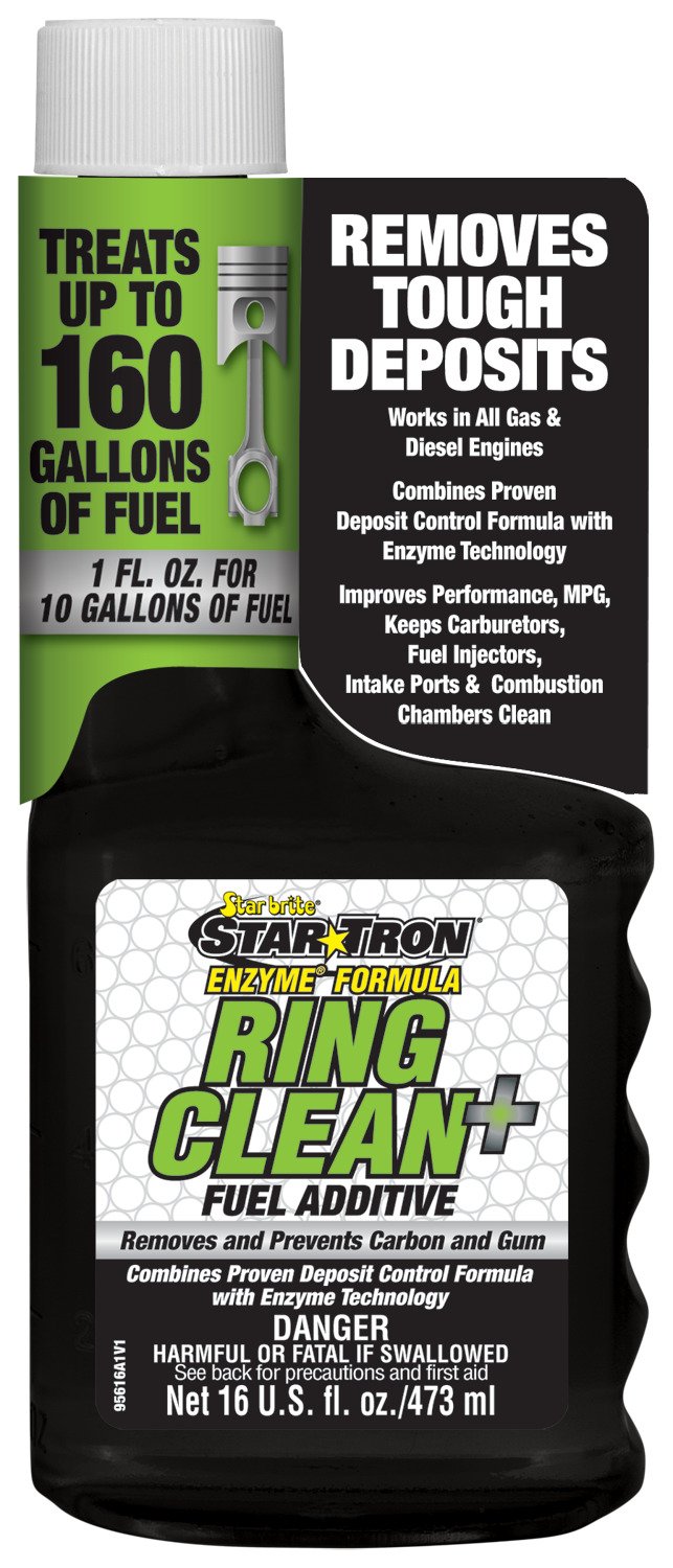 Help keep your gasoline or diesel engines clean and running smoothly with the Star brite Star Tron Ring Clean+, which contains deposit control compounds and an enzyme package designed to remove existing deposits and help prevent new deposits. Helps improve fuel combustibility to keep engines operating at peak performance. Helps keep carburetors, fuel injectors, intake ports and combustion chambers clean. Can be used every time fuel is added. Great for removing deposits caused by ethanol-blended fuel. 16 oz. bottle.