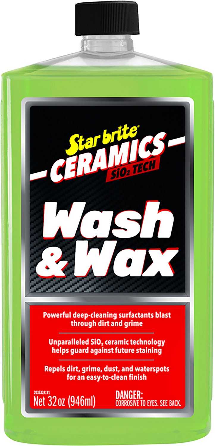 Give surfaces a shine with the Starbrite Ceramics 32 oz Wash & Wax. Wash & Wax helps treat dirt, grime, salt, blood, fish guts, grease and UV fading, making it suitable for use on aluminum, fiberglass, stainless steel, chrome, painted surfaces and more.