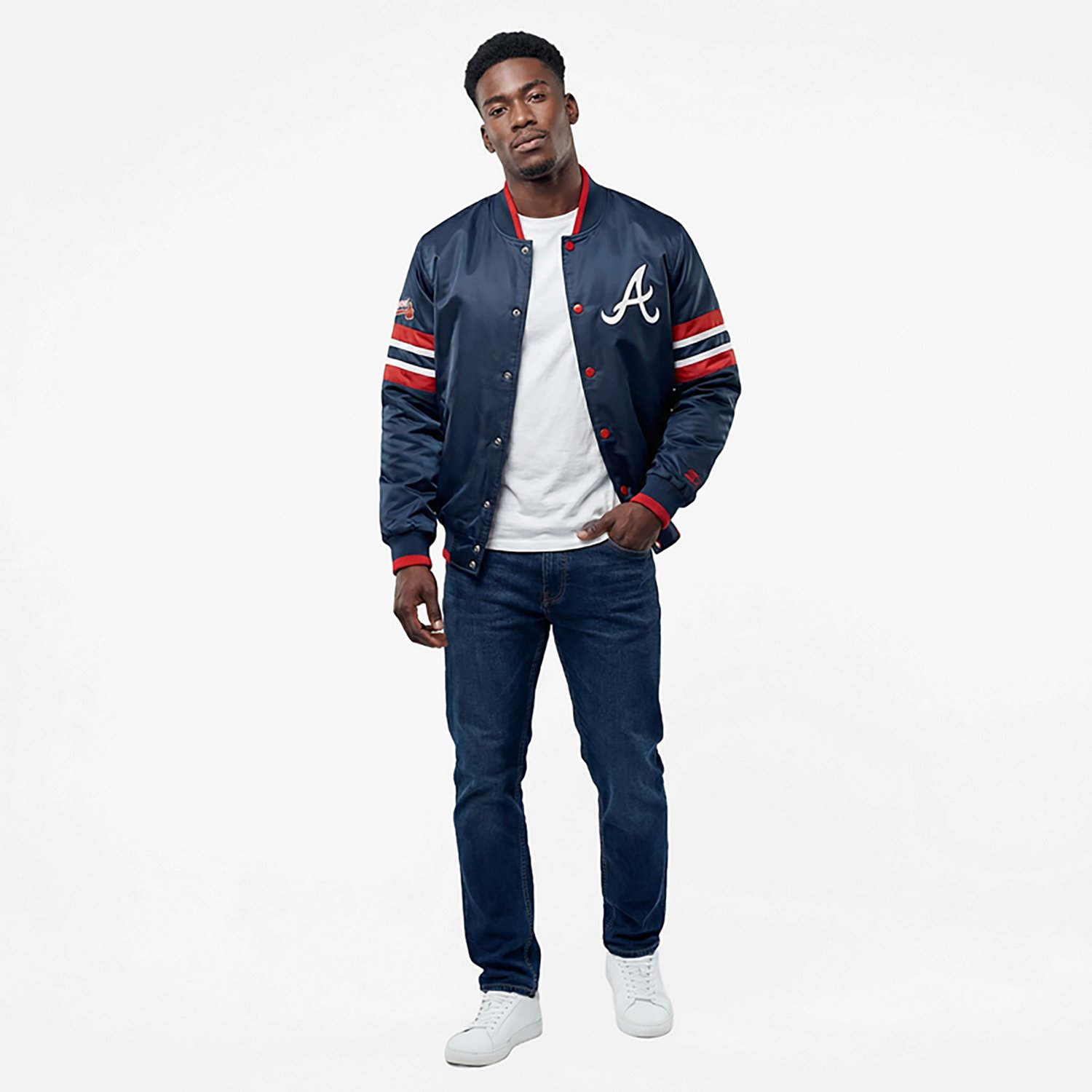 Stay warm as you root for your favorite team with the Starter Men's Atlanta Braves Scout I Varsity Long Sleeve Jacket. Its polyester box twill satin is designed for regular wearing, and the team colors show your devotion to your favorite club. The jacket's logos and wordmarks make it clear to everyone whom you support during the baseball season.
