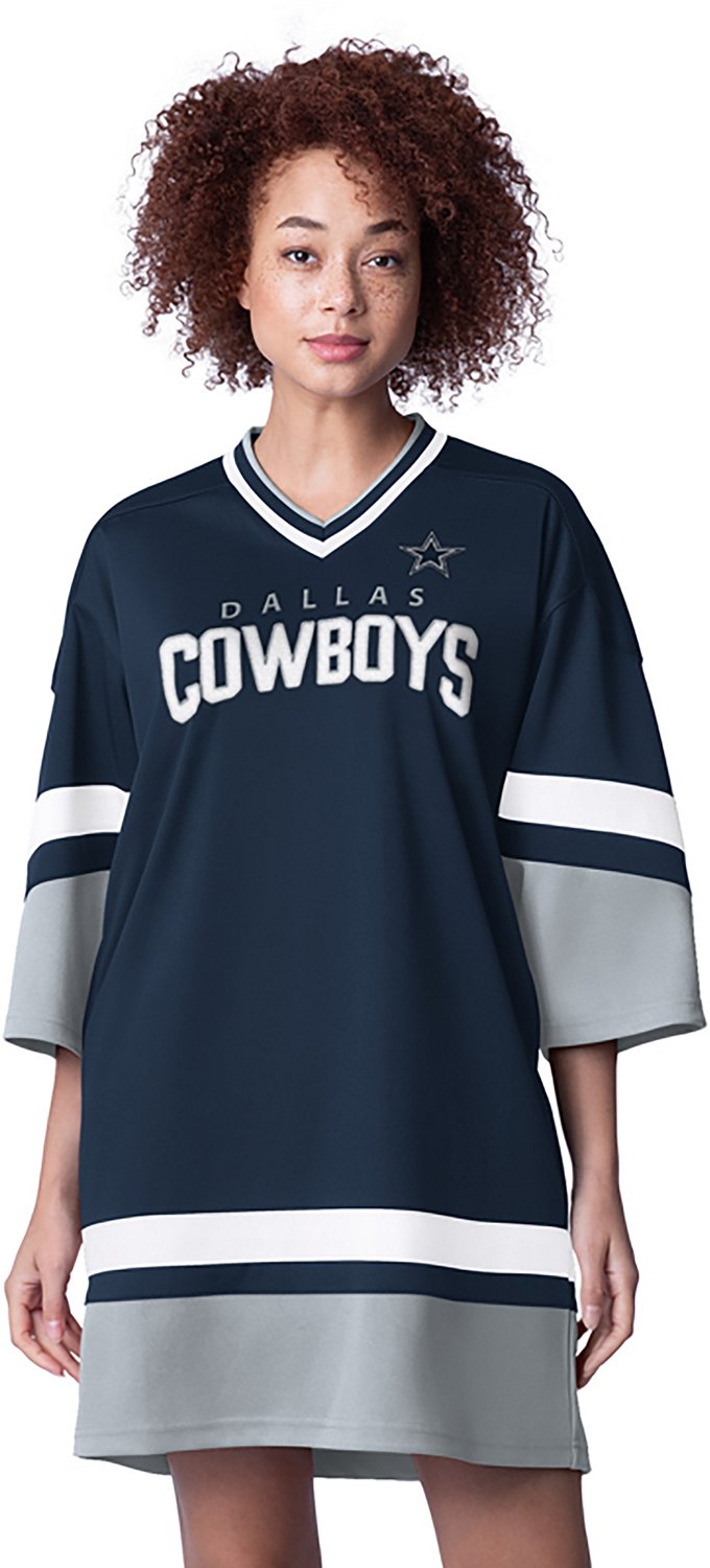 Bring one-of-a-kind style to gameday with this Starter Women's Dallas Cowboys Slap Shot Dress. It has roomy 3/4-length sleeves for comfort and a trendy style, and the dress features a V-neck similar to a football jersey. Features a Dallas Cowboys wordmark and logo.