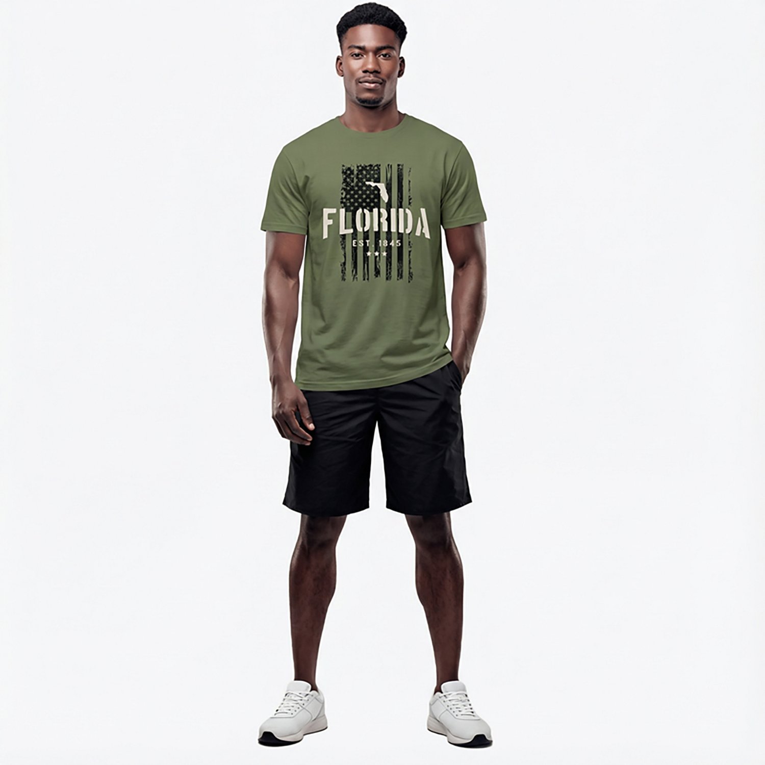 Put your state pride on display when you wear the State Life Men's FL Freedom Flag T-shirt. The polyester and cotton construction helps keep you comfortable all day long, and the graphic design delivers an eye-catching appearance.