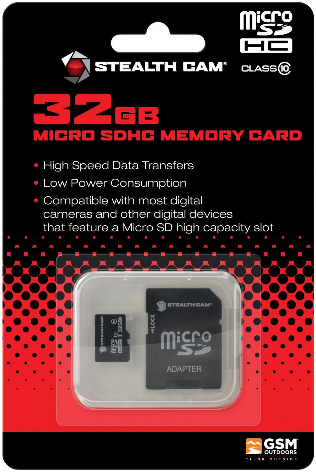 The Stealth Cam 32GB Micro SDHC Memory Card adds reliable memory to your game camera. The design provides higher speed data transfers and lower power construction. The card is Speed Class 10 and has a 32GB storage capacity.