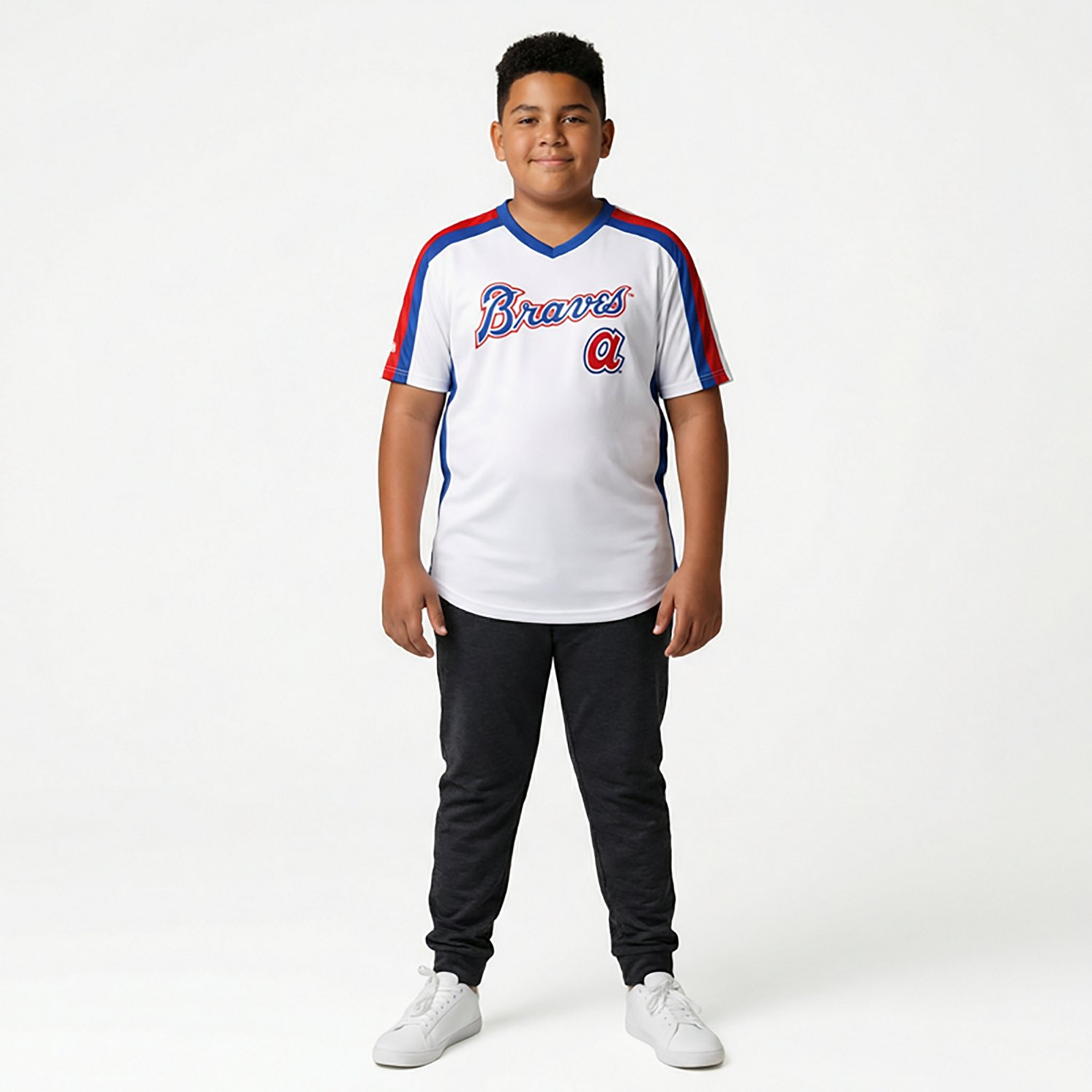 Support your favorite club in style with the Stitches Boys' Atlanta Braves RBI Shirzy Short Sleeve T-shirt. The polyester material is developed for wearing often, and the V-neckline gives the shirt a classy look. The original fit helps you feel comfortable, and the sublimated center chest graphic demonstrates your loyalty.