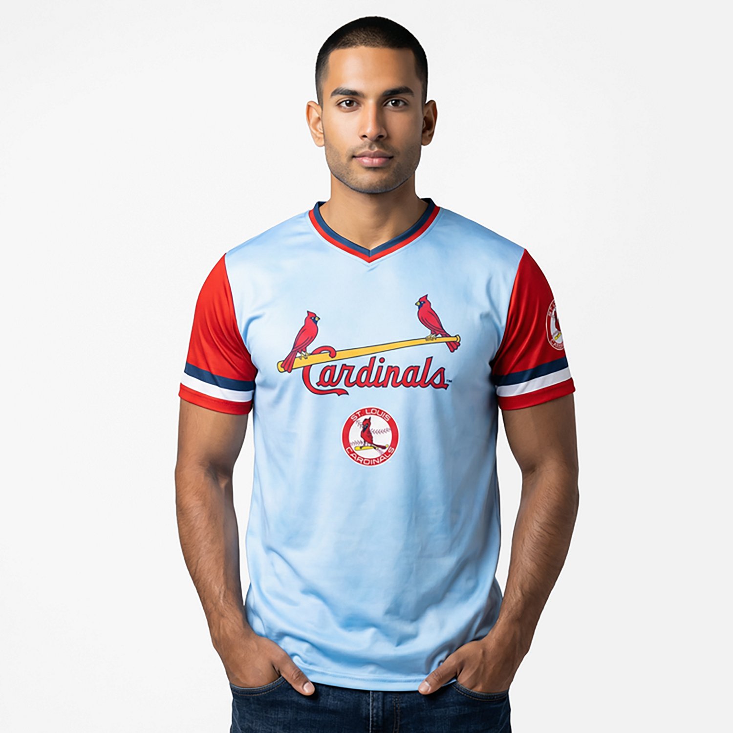 Follow your favorite club during the season while wearing a reliable apparel item with the Stitches Men's St. Louis Cardinals 25 Bombs Away Shirzy Short Sleeve T-shirt. The V-neckline gives the shirt a classy look, and the original fit helps make for an easygoing wearing experience. The sublimated center chest and left sleeve graphics demonstrate your passion for your team, and the polyester material is made for regular use.