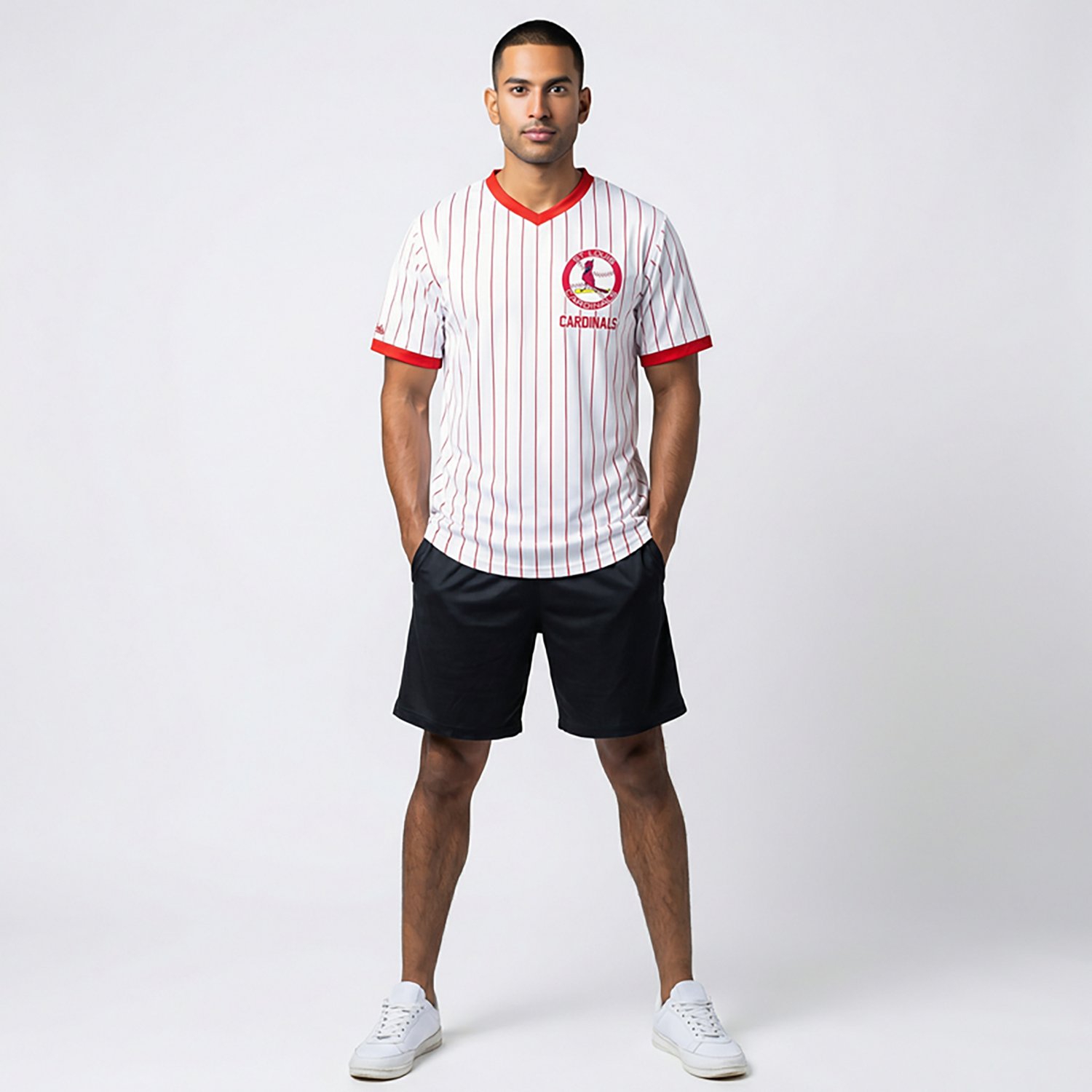 Represent your team in vintage style with this Stitches Men's St. Louis Cardinals Rookie T-shirt. It is made of 100% polyester for durability and a jersey-like feel, and the V-neck delivers a throwback look and a comfortable feel. Features a team logo on the left chest.