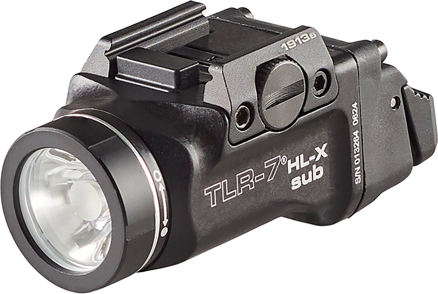 Improve your visibility with the Streamlight TLR-7 HL-X Sub USB Rail-Mounted Light. Its powerful 1,000-lumen beam illuminates dark areas. The 6000 Series machined aircraft aluminum construction with a black anodized finish enhances durability, and its specialized clamp system includes high and low paddle switches to match your shooting style. The safe-off feature prevents accidental activation to save your battery's life.