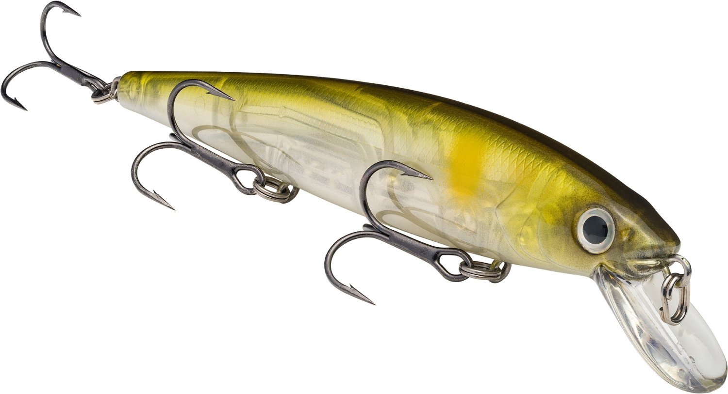 Great for attracting bass, the Strike King KVD 300 Slash Bait uses a combination of rolling, wiggling and flashing to attract fish and is designed for freshwater use. This jerk bait has a weight transfer system to promote castability and features 3-D eyes and 3 No. 4 black nickel premium treble hooks. 4-3/4" long.