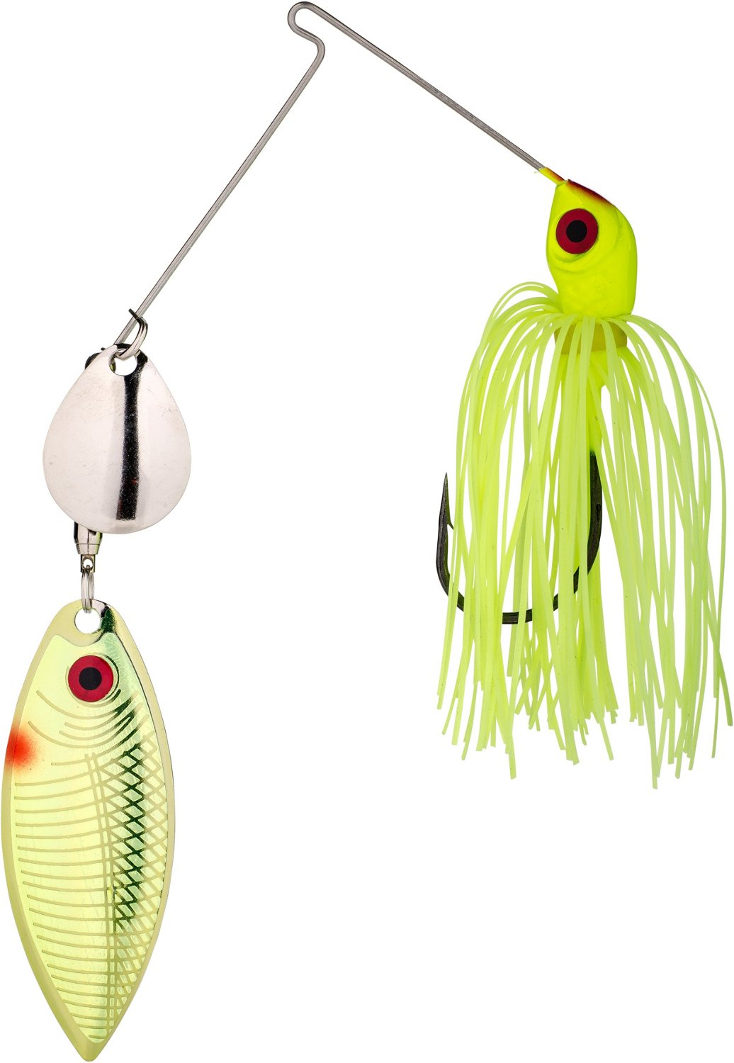 The Strike King Mini-King Red Eyed Special 3/8 oz Spinnerbait works well in shallow and small waters. This bushy-tailed bait has a red eye on the head and tail to grab the attention of bass, and the flared-gill fish-shaped head and silicone skirt are lifelike. A holographic decal creates flash.