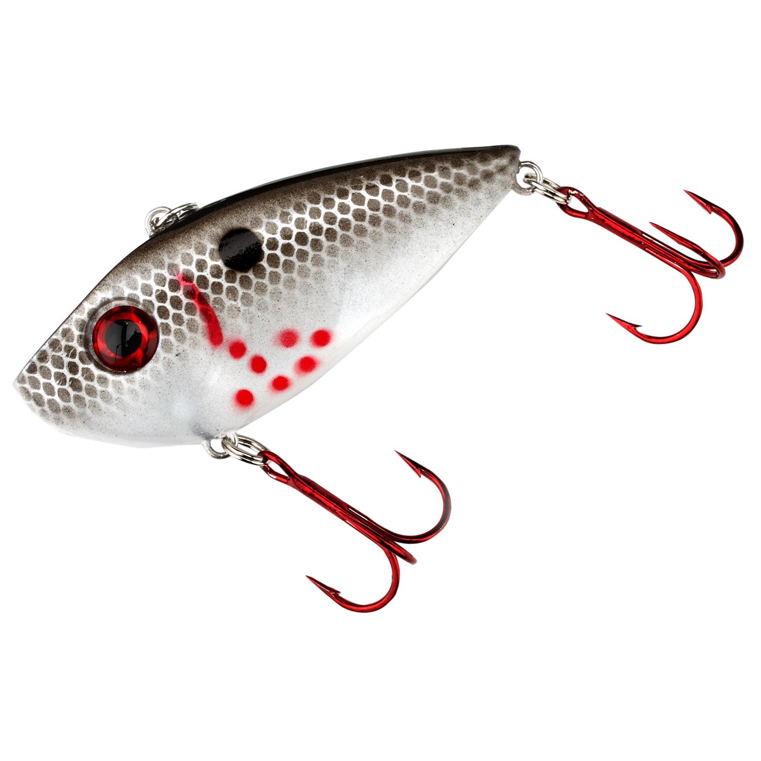 The unique shad-style body of the Strike King Red Eyed Shad 1/2 oz 3-D Lipless Crankbait provides excellent action and sound in the water. The 3-D eyes and paint scheme offer a lifelike appearance, and the free-floating rattles provide great action and sound. Ideal for attracting bass in freshwater fishing applications. Two No. 6 treble hooks.