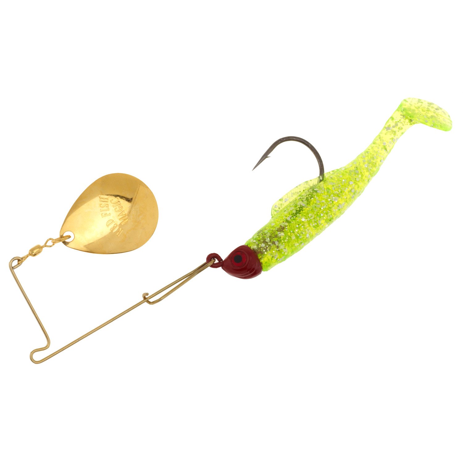 The Strike King Redfish Magic™ Saltwater 1/4 oz Spinnerbait is made from a soft, tear-resistant material that is flexible and extremely durable for more action and large catches. The jig head features chip-resistant paint and 3-D eyes for a lifelike appearance. The swivel and split rings,#4 Colorado blade and heavy-gauge, stainless-steel "R" bend wire are gold plated for durability, and the size 4/0, saltwater, black-nickel needlepoint hook secures your catch.