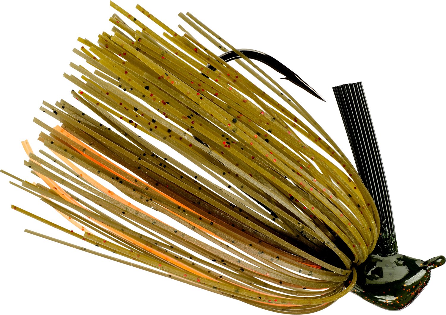 Skip the Strike King Tour-Grade Skipping Jig across the water even under boat docks with its unique head shape and draw curious, hungry fish to your line. Bass can't resist the lifelike, powder-coat painted design, color-coordinated weed guard and skirt, and the Gamakatsu single hook is strong enough to resist bending when banged against hard cover.