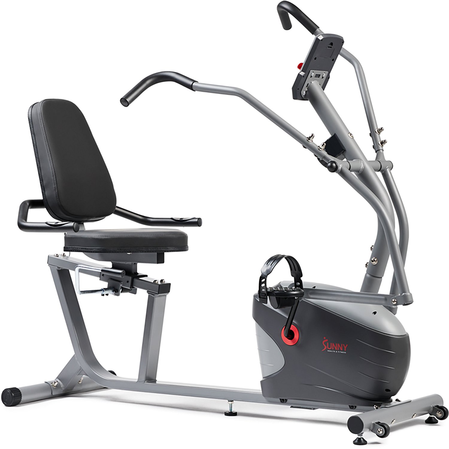 Work out at home with the Sunny Health & Fitness Performance Interactive Series Recumbent Bike. This bike offers eight resistance levels on the pedals themselves, while included resistance bands can be added to take your workout to the next level. The seat easily adjusts to fit your height, and the easy-to-reach pulse sensors track your heart rate in real time, allowing you to track your fitness goals.