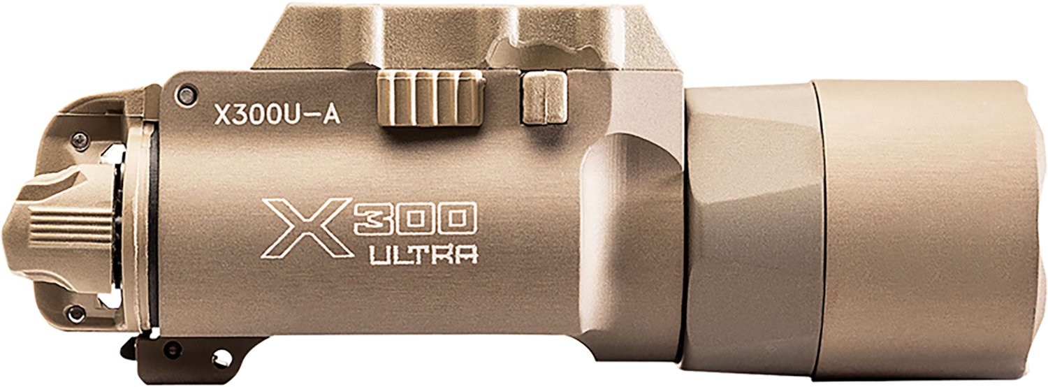 Equip your pistol with the SureFire X300U-A-TN Ultra Light. The aluminum construction affords durability, while IPX7 waterproof technology defends against the elements. The LED bulb produces up to 1,000 lumens of light for up to 1.25 hours.