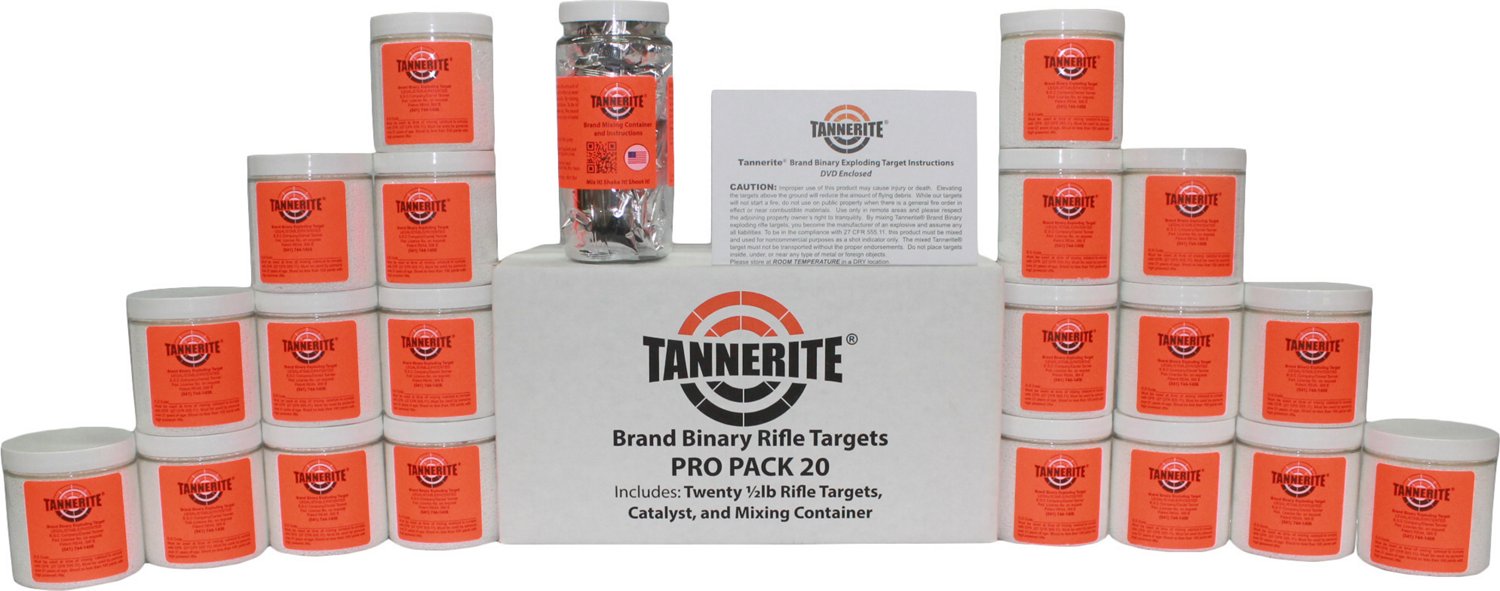 Designed to explode when hit at speeds of at least 2,000 fps, the Tannerite 1/2 lb. Binary Targets 20-Pack are compatible with centerfire rifles. These targets come with 20 catalyst packs and a mixing container to combine the compounds. The clear jar comes with a blaze orange label to aim at. 3.5"H x 3.25"W x 3.25"L.