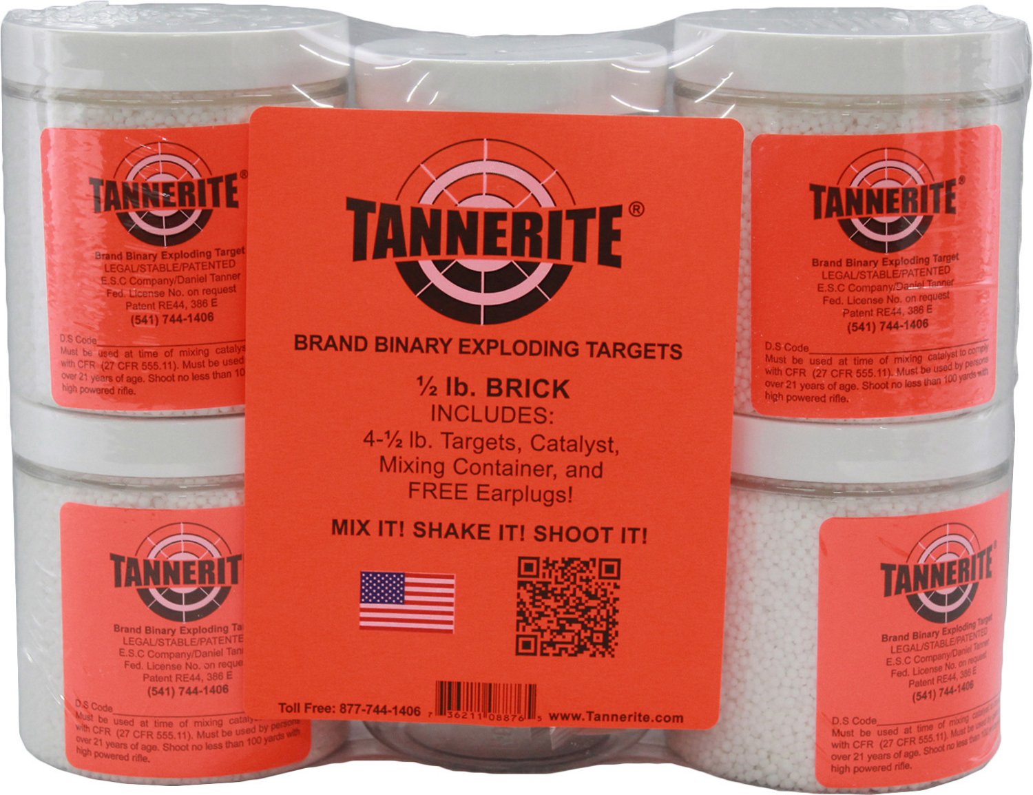 Designed to explode when hit at speeds of at least 2,000 fps, the Tannerite 1/2 lb. Brick Binary Targets 4-Pack are compatible with centerfire rifles. These targets come with 4 catalyst packs and a mixing container to combine the compounds. The clear jar comes with a blaze orange label to aim at. 3.5"H x 3.25"W x 3.25"L.